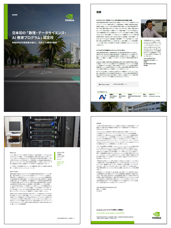 阿南高専のこうした取り組みは、国 (文科省) も高く評価しており、2023年から始まった高度情報専門人材の確保に向けた「大学・高専機能強化支援事業」の対象校に選ばれた。全国に高専は57校あるが、今回支援事業の対象となった高専は5校のみだ。対象校には最大10億円程度まで、最長10年の支援が行われることになる。これを受けて阿南高専では、2025年度から現在の5コースに、AIを活用としたものづくりや高度な情報技術を学ぶことができる情報系プログラムを設置するとしており、今回導入した NVIDA GPUがフルに活用されることになるだろう。