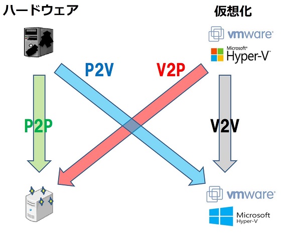さて、この「P2P型ハード入替サービス」は、これまでの移行経験により培ったファナティックならではの独自の移行サービスですが、実は「P2P(物理→物理)」だけにとどまらず、「P2V(物理→仮想)」や「V2V(仮想→仮想)」などの仮想化への移行、さらには「V2P(仮想→物理)」も得意なのです。