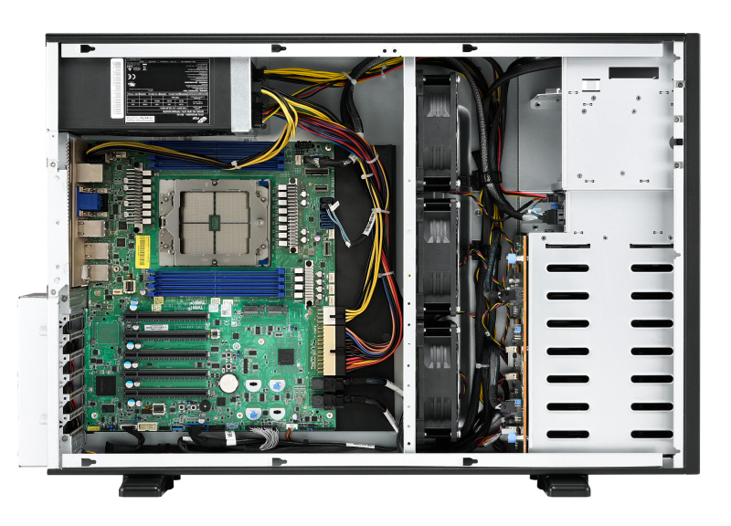 8つの3.5インチSATAと2つのNVMe U.2ドライブベイを搭載。ホットスワップに対応しており、ツールの用意を必要とせずにメンテナンスが可能です。また2つのNVMe M.2 22110 / 2280スロットを搭載しており、OSやアプリケーションの高速起動や高い耐久性が求められる場面での用途に利用できます。