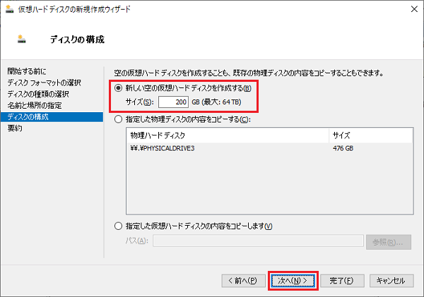 ③「仮想ディスクの新規作成ウィザード」が開く。「次へ」を選択。