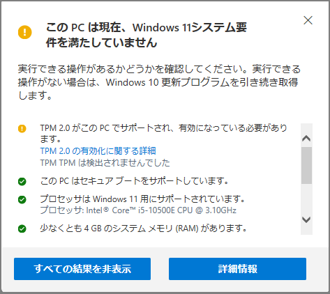 チェック後、図3のように表示された場合は、現状のままだとWindows 11に対応していない状態になります。